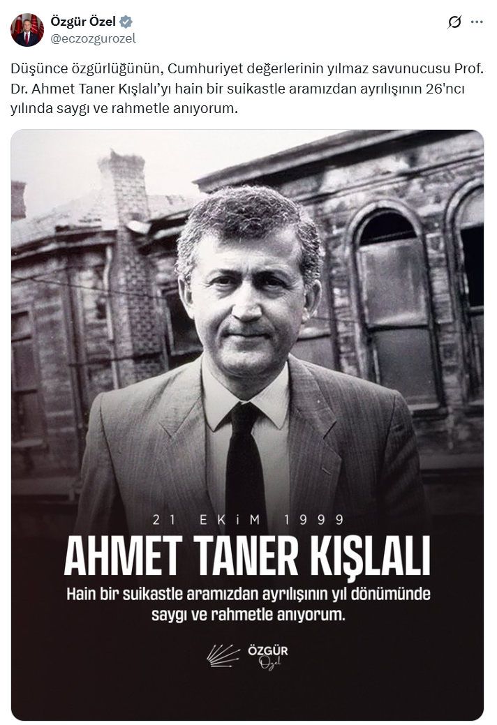 CHP lideri Özgür Özel'in paylaşımında, "Düşünce özgürlüğünün, Cumhuriyet değerlerinin yılmaz savunucusu Prof. Dr. Ahmet Taner Kışlalı’yı hain bir suikastle aramızdan ayrılışının 26'ncı yılında saygı ve rahmetle anıyorum" ifadeleri yer aldı.