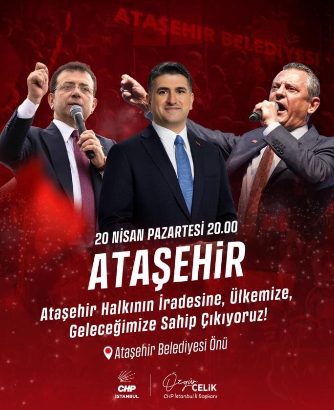 "Onursal Adıgüzel’in yanındayız! Ataşehir halkının iradesine, ülkemizin geleceğine sahip çıkıyoruz. Adalet, demokrasi ve özgürlük için Genel Başkanımız Özgür Özel liderliğinde buluşuyoruz."