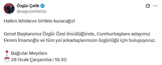 "Halkın iktidarını birlikte kuracağız! Genel Başkanımız Özgür Özel öncülüğünde, Cumhurbaşkanı adayımız Ekrem İmamoğlu ve tüm yol arkadaşlarımızın özgürlüğü için buluşuyoruz."