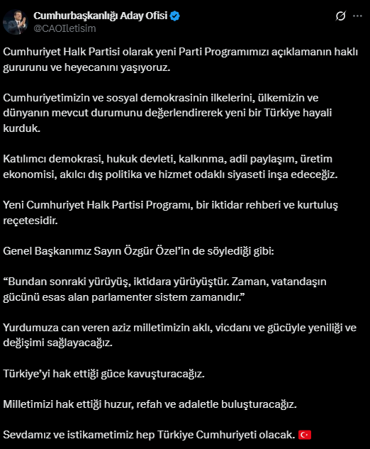 "Cumhuriyet Halk Partisi olarak yeni Parti Programımızı açıklamanın haklı gururunu ve heyecanını yaşıyoruz.