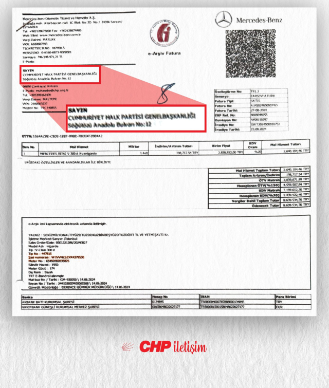 ÖDEME BELGESİ PAYLAŞILDIParti tarafından yapılan paylaşımda, aracın ücretinin CHP Genel Merkezi tarafından ödendiğini gösteren dekont kamuoyuyla paylaşıldı. Açıklamada, “Yalanlarla gündem oluşturmaya çalışanlar, Genel Merkezimizin yaptığı ödemenin belgesine iyi baksın” denildi. Paylaşılan dekontta aracın değerinin 7 milyon 920 bin TL olduğu görüldü.