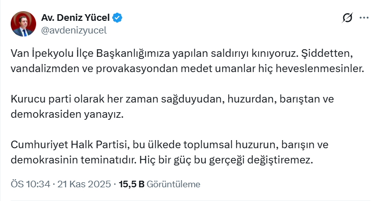 CHP Genel Başkan Yardımcısı ve Parti Sözcüsü Deniz Yücel, partisinin Van İpekyolu İlçe Başkanlığı Binası'na yönelik gerçekleştirile saldırıya sosyal medya hesabından tepki gösterdi.