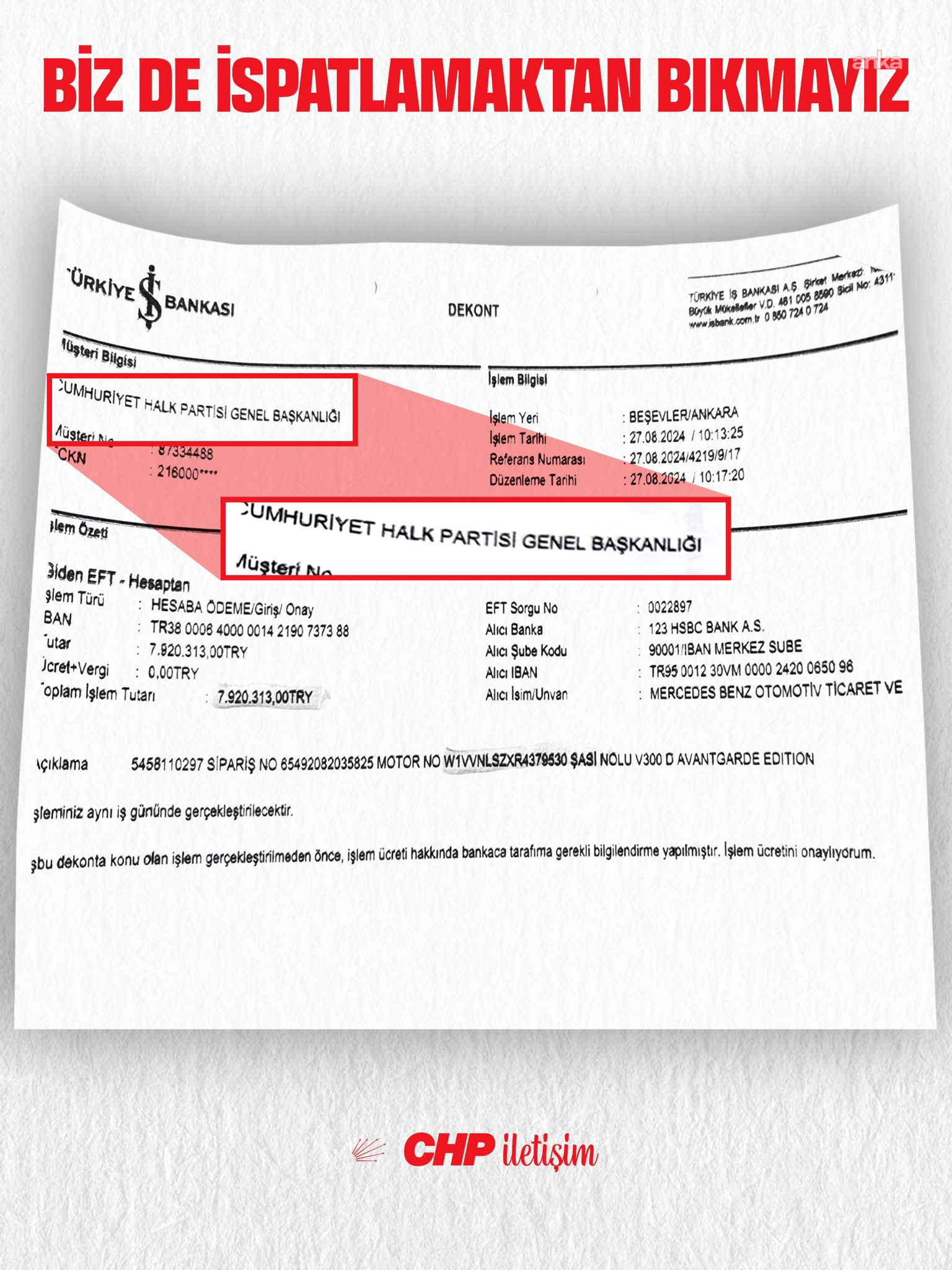 CHP Genel Merkezi'ne ait "CHP İletişim" isimli sosyal medya hesabından yapılan açıklamada, "Genel Başkanımızın makam aracıyla ilgili iftiralar havada uçuşunca bu belgeyi yayınlamak şart oldu. Yalanlarla gündem oluşturmaya çalışanlar, Genel Merkezimizin yaptığı ödemenin belgesine iyi baksın" ifadeleri kullanıldı.