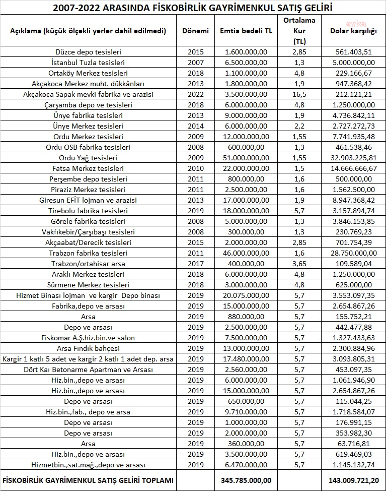 Adıgüzel, Bayraktar döneminde FİSKOBİRLİK’e ait çok sayıda taşınmazın satıldığını belirterek, İstanbul Maltepe’den Artvin Borçka’ya, Düzce, Akçakoca, Samsun, Ünye, Fatsa, Ordu, Perşembe, Piraziz, Giresun, Tirebolu ve Görele’ye kadar uzanan geniş bir liste açıkladı.