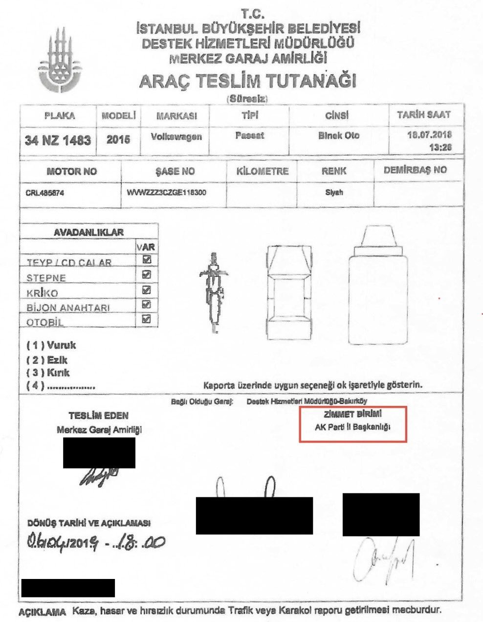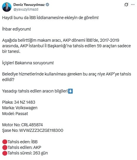 CHP’li Yavuzyılmaz, aracın Volkswagen Passat marka olduğunu belirterek, 34 NZ 1483 plakalı aracın 18 Temmuz 2018 tarihinde 263 gün süreyle AKP İstanbul İl Başkanlığı’na verildiğini söyledi.