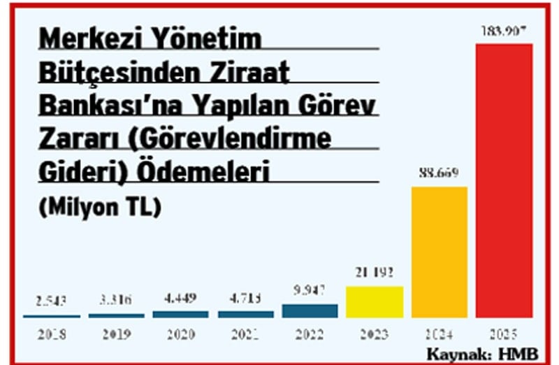 Ziraat Bankası’na görevlendirme gideri olarak bütçeden yapılan ödemelerin gelişimini aşağıdaki grafik çok çarpıcı şekilde ortaya koymaktadır.