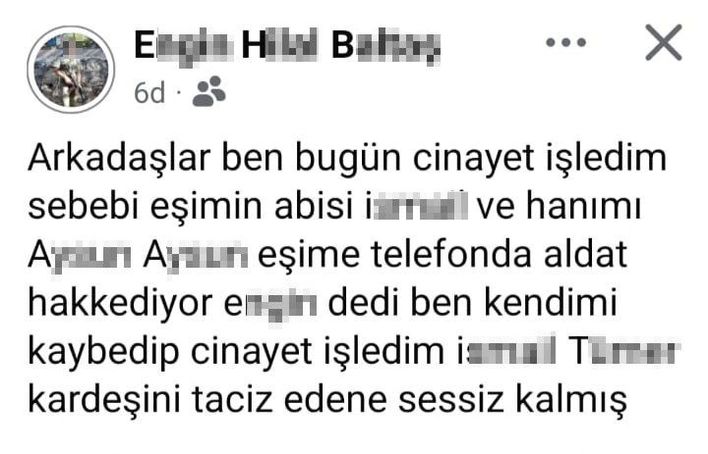 CİNAYETİ İTİRAF ETTİ Öte yandan, zanlı Engin B.'nin, cinayetin ardından sosyal medya hesabından paylaşım yaptığı belirlendi. Engin B.'nin, paylaşımında, "Arkadaşlar ben bugün cinayet işledim. Sebebi, eşimin abisi İ. ve hanımı A. eşime telefonda 'Aldat, hak ediyor Engin' dedi. Ben kendimi kaybedip cinayet işledim. İ.T., kardeşini taciz edene sessiz kalmış" ifadelerini kullandığı görüldü. Olayın ardından çiftin 5 aylık ve 6 yaşındaki erkek çocukları ile 11 yaşındaki kız çocuğunun devlet koruması altına alındığı öğrenildi.
