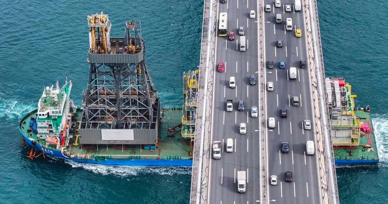 Osman Gazi Yüzer Üretim Platformu'nun parçaları ile Yıldırım Sondaj Gemisi'nin kulesini taşıyan geminin boğazdan geçişi 2 saat sürdü.