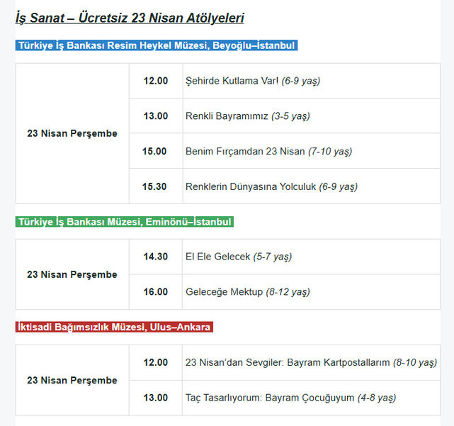 Tüm atölyelerin tarih ve saatlerine İş Sanat’ın internet sitesinden ulaşabilir, ücretsiz olarak rezervasyon yaptırabilirsiniz. Beyoğlu’ndaki Türkiye İş Bankası Resim Heykel Müzesi, 21-26 Nisan tarihleri arasında ücretsizdir. İstanbul, Eminönü’ndeki Türkiye İş Bankası Müzesi ve Ankara’daki İktisadi Bağımsızlık Müzesi ücretsiz olarak ziyaret edilebilir.