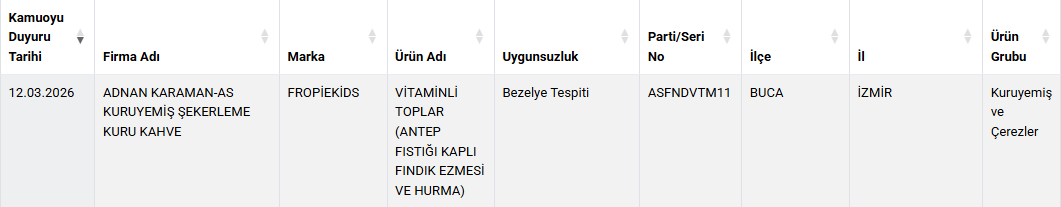 "Aynı Değeri Taşımayan Madde Eklenmesi" tespit edilen listede is çocuklara yönelik bir atıştırmalık dikkat çekti.