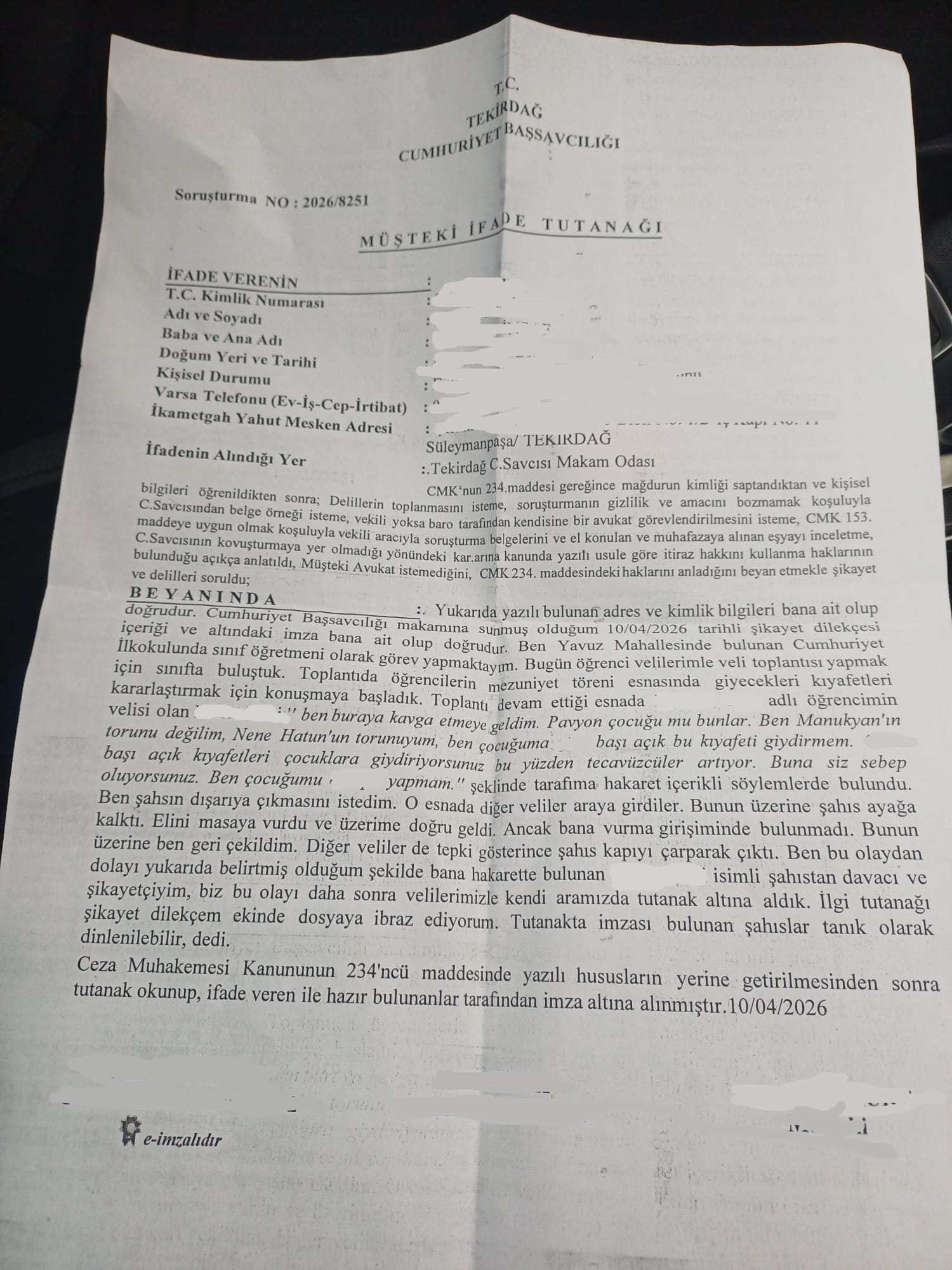 ÖĞRETMENLERDEN SUÇ DUYURUSU“Ben buraya kavga etmeye geldim. Pavyon çocuğu mu bunlar? Ben Manukyan'ın torunu değilim, Nene Hatun'un torunuyum. Ben çocuğuma .... başı açık kıyafet giydirmem. .... Başı açık kıyafetleri çocuklara giydiriyorsunuz bu yüzden tecavüzler artıyor. Buna siz sebep oluyorsunuz. Ben çocuğumu ... yapmam”
