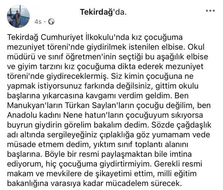 “Tekirdağ Cumhuriyet İlkokulu'nda kız çocuğuma mezuniyet töreni'nde giydirilmek istenilen elbise. Okul müdürü ve sınıf öğretmeninin seçtiği bu aşağılık elbise ve giyim tarzını kız çocuğuma dikta ederek mezuniyet töreninde giydireceklermiş. Siz kimin çocuğuna ne yapmak istiyorsunuz farkında değilsiniz, gittim okulu başlarına yıkarcasına kavgamı verdim geldim. Ben Manukyan'ların Türkan Saylan'ların çocuğu değilim, ben Anadolu kadını Nene Hatun'ların çocuğuyum sıkıyorsa buyurun giydirin görelim bakalım dedim. Sözde çağdaşlık adı altında sergileyeceğiniz çıplaklığa göz yumamam ve de müsaade etmem dedim, yıktım sınıf toplantı alanını başlarına. Böyle bir resmi paylaşmaktan bile imtina ediyorum, hiç çocuğuma giydirtir miyim. Gerekli resmi makam ve mevkilere de şikayetimi ettim, milli eğitim bakanlığına varasıya kadar mücadelem sürecek."