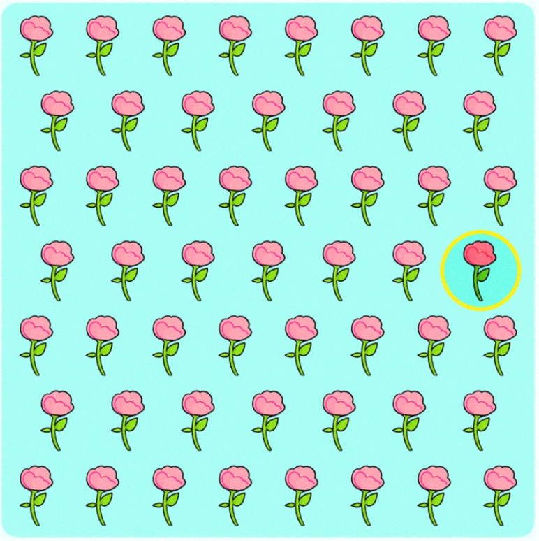 Birbirinin tıpatıp aynısı olan güllerden biri diğerlerinden farklı. Sizlerden istenen ise farklı gülü 6 saniyede bulmanız. Sadece bir dahi bu görseldeki farklı gülü 6 saniyede buluyor.