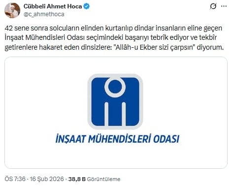 “42 sene sonra solcuların elinden kurtarılıp dindar insanların eline geçen İnşaat Mühendisleri Odası seçimindeki başarıyı tebrîk ediyor ve tekbîr getirenlere hakaret eden dinsizlere: "Allâh-u Ekber sizi çarpsın" diyorum.”