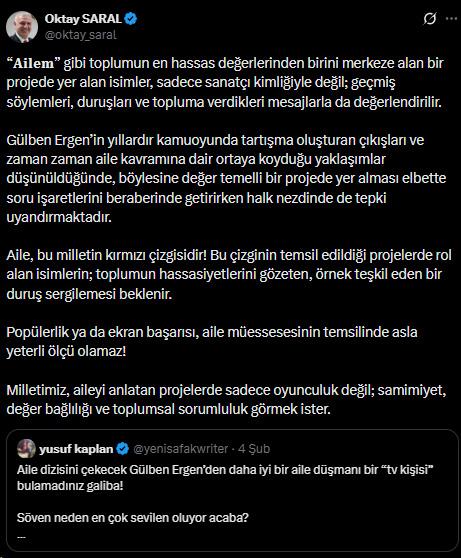 Saral, Ergen'i eleştiren bir paylaşımı alıntılayarak yaptığı değerlendirmede, aile temalı projelerde yer alacak isimlerin toplumsal karşılıklarının önem taşıdığını ifade etti.