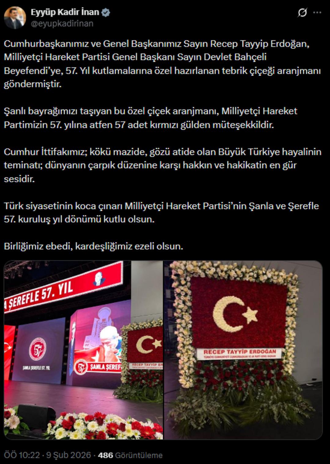 AK Parti Genel Sekreteri ve İzmir Milletvekili Eyyüp Kadir İnan da hediyeye ilişkin sosyal medyada bir paylaşım yaptı. İnan, Cumhurbaşkanı ve AK Parti Genel Başkanı Recep Tayyip Erdoğan'ın Milliyetçi Hareket Partisi Genel Başkanı Devlet Bahçeli Beyefendi’ye, 57. yıl kutlamalarına özel hazırlanan tebrik çiçeği aranjmanı gönderdiğini belirterek şunları kaydetti: