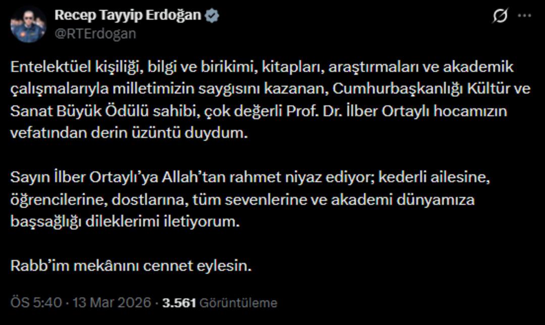 CUMHURBAŞKANI ERDOĞAN: "DERİN ÜZÜNTÜ DUYDUM"Cumhurbaşkanı Recep Tayyip Erdoğan sosyal medya hesabından yaptığı paylaşımla Ortaylı için başsağlığı diledi. Paylaşımında "Entelektüel kişiliği, bilgi ve birikimi, kitapları, araştırmaları ve akademik çalışmalarıyla milletimizin saygısını kazanan, Cumhurbaşkanlığı Kültür ve Sanat Büyük Ödülü sahibi, çok değerli Prof. Dr. İlber Ortaylı hocamızın vefatından derin üzüntü duydum" ifadelerine yer veren Erdoğan şunları kaydetti: