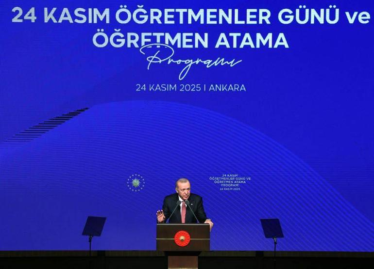 Cumhurbaşkanı Erdoğan, "Toplumda ve her birimizin hayatında bu kadar özel bir konuma sahip olan öğretmenlerimize haklarını teslim etmek bizim asli vazifemizdir. Son 23 yılda hep böyle bir çabanın içinde olduk. Ülkemizin büyümesine, Türkiye ekonomisinin imkanlarının genişlemesine paralel olarak bunu en önce öğretmenlerimize, en önce eğitime yansıttık. Eğitimin niteliğini artırmak, eğitimi yaygınlaştırmak, eğitimin önündeki engelleri ve yasakları kaldırmak, öğrencilerimiz arasında fırsat eşitliğini sağlamak için ilk günden beri çalışıyoruz. 2002'de Milli Eğitim Bakanlığımız, merkezi yönetim bütçesi içinde 4’üncü sıradaydı. 2003’ten itibaren eğitime birinci sırayı tahsis ettik; 2026 bütçesinde de bu önceliği aynen koruduk. Milli Eğitim Bakanlığımıza 2026’ta 1 trilyon 944 milyar lira kaynak ayırdık. Yine aynı dönemde derslik sayımız 343 bindi, bugün 616 bine yükseldi. Özel okullar dahil edildiğinde bu rakam 754 bine yaklaşıyor. Yani bizden evvel yapılan derslik sayısının iki katını, biz sadece 23 senede ülkemize kazandırmanın kıvancını yaşadık. Okullarımızda görev yapan öğretmen sayısında da ciddi artışlar oldu. 2002’den bu yana 821 bin 360 öğretmenin atamasını yaptık. Şu an resmi eğitim kurumlarında çalışan öğretmen sayımız 1 milyon 34 bini aşmıştır. Aktif görevdeki her 10 öğretmenden 8’i bizim dönemimizde atandı. Bu büyük dönüşüm, sınıfların içinde de somut şekilde hissediliyor. Öğretmen başına 70-80 kişilik kalabalık sınıflarda eğitim almıştık, şimdi evlatlarımız 20-25 kişilik sınıflarda eğitim görüyor. Dünyada bu kadar kısa sürede böyle oranları yakalayan çok az ülke vardır. Türkiye hamdolsun bunu bizim dönemimizde başarmıştır" dedi.