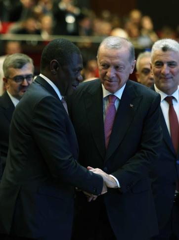Erdoğan, "Burada yeni dostlukların kurulmasını, yeni iş birliklerinin oluşmasını ve yeni ortaklıkların tesis edilmesini önemsiyor, bunların kalıcı olmasını diliyorum. Şunu da özellikle ifade etmek isterim. Hızla büyüyen ekonomisiyle, hızla gelişen yatırım ortamıyla ve 3 kıtanın tam merkezindeki coğrafi konumuyla Türkiye’nin kapısı, dünyanın farklı bölgelerinden gelen her yatırımcıya ve girişimciye ardına kadar açıktır. Devletimizin ilgili tüm kurumları, ilgili bakanlıklarımız ve Cumhurbaşkanlığına bağlı yatırım ajansımız, ülkemize huzurla yatırım yapmak isteyen herkese gereken desteği vermeye hazırdır. Bunu buradaki tüm dostlarımızın çok iyi bilmesini rica ediyorum. Ülkemizde bulunduğunuz süre zarfında sizler de şahit oldunuz. Hiçbir ayrım yapmadan, hiçbir ön yargı taşımadan özellikle kimseye bir dayatmada bulunmadan, eşitlik, karşılıklı saygı ve kazan-kazan ilkesi temelinde tecrübemizi, siyasi ve kültürel birikimimizi sizlerle samimiyetle paylaşmanın gayreti içerisindeyiz. 2005’i ülkemizde 'Afrika Yılı' ilan ederek kıtayla ilişkilerimizde yeni bir sayfa açtık. O günden bu yana tam 20 sene geçti. Bu 20 yılda elele, omuz omuza, hepsinden öte gönül gönüle vererek ilişkilerimizi hayal dahi edilemeyecek noktalara getirdik.Türkiye-Afrika ilişkilerinin müşterek çabalarımızla stratejik ortaklık seviyesine ulaşmasından fevkalade memnunuz.Bu sene ayrıca, ülkemizin Afrika Birliği’ndeki gözlemci statüsünün 20’nci yılını idrak ediyoruz. Gelecek yıl, Türkiye-Afrika Ortaklık Zirvesi’nin dördüncüsünü tertipleyeceğiz. Hazırlıklarına başladığımız bu önemli zirvenin, kıtanın kalkınmasına ve refahına yönelik gayretlerimizin yeni bir nişanesi olacağına inanıyorum" dedi.