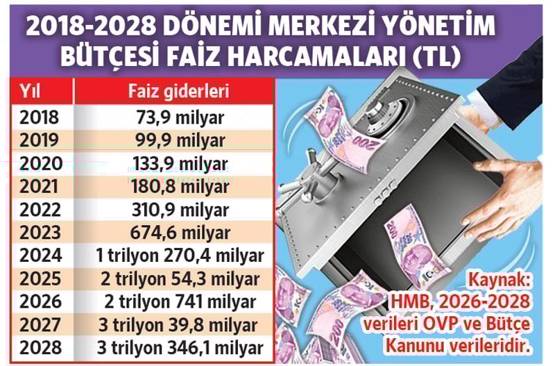 2025 yılındaki bütçe açığı 1.8 trilyon lira olarak gerçekleşti. Devasa bir rakam. Ama bu daha iyi günler. OVP’ye göre 2026 yılında 2.7 trilyon, 2027 yılında 2.7 trilyon ve 2028 yılında 2.8 trilyon olmak üzere üç yılda 8.2 trilyon lira bütçe açığı olacak.