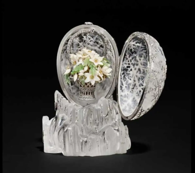 BU KADAR PAHALI OLMASININ DA BİR SEBEBİ VARFabergé yumurtasının bu kadar pahalı olmasının tabii ki kendine göre nedenleri var. Şeffaf kaya kristalinden oyulan yumurta, adeta donmuş bir su damlası gibi görünüyor. Üzerinde tam 4.500 adet elmas ve platin kar tanesi motifi işli. Bunlar da yetmezmiş gibi yumurta açıldığında içinden beyaz kuvars, yeşim ve nadide taşlardan yapılmış minyatür bir çiçek sepeti çıkıyor.