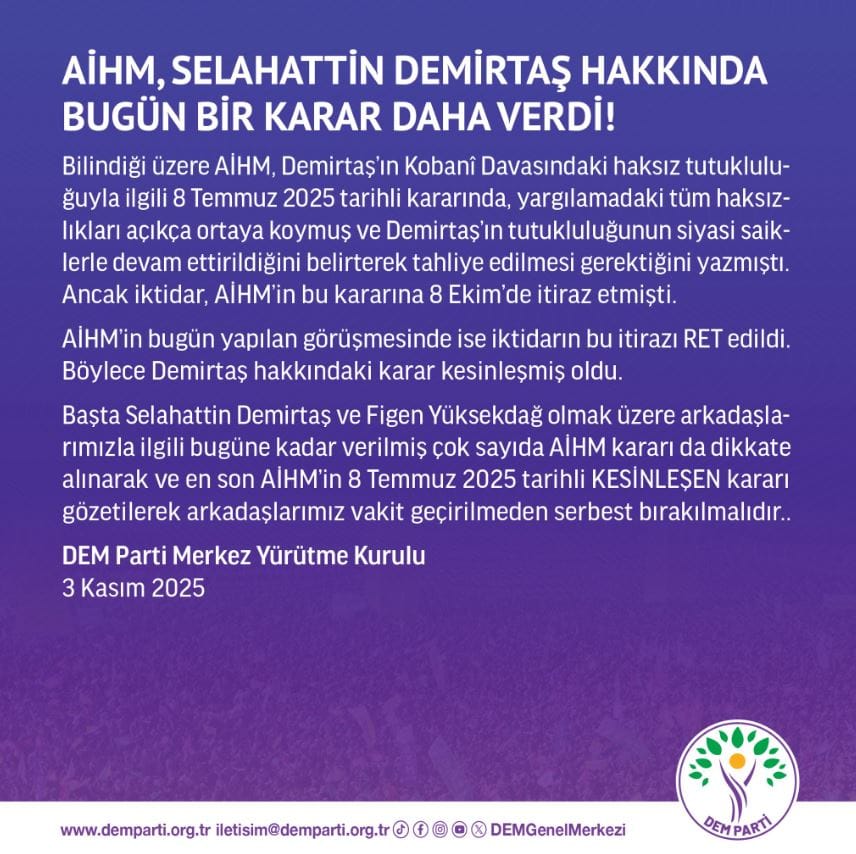 "AİHM'in bugün yapılan görüşmesinde ise iktidarın bu itirazı RET edildi. Böylece Demirtaş hakkındaki karar kesinleşmiş oldu. Başta Selahattin Demirtaş ve Figen Yüksekdağ olmak üzere arkadaşlarımızla ilgili bugüne kadar verilmiş çok sayıda AİHM kararı da dikkate alınarak ve en son AİHM'in 8 Temmuz 2025 tarihli KESİNLEŞEN kararı gözetilerek arkadaşlarımız vakit geçirilmeden serbest bırakılmalıdır."