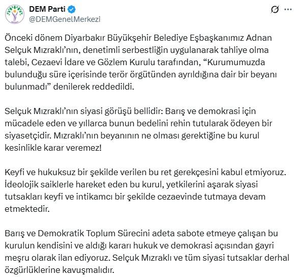 DEM PARTİ: SELÇUK MIZRAKLI'NIN TAHLİYESİ CEZAEVİ YÖNETİMİ TARAFINDAN REDDEDİLDİAçıklamada, Mızraklı'nın tahliye olmama sebebi ile ilgili cezaevi yönetimi tarafından engellendiği denildi. Açıklamada şu ifadelere yer verildi: "Önceki dönem Diyarbakır Büyükşehir Belediye Eşbaşkanımız Adnan Selçuk Mızraklı'nın, denetimli serbestliğin uygulanarak tahliye olma talebi, Cezaevi İdare ve Gözlem Kurulu tarafından, "Kurumumuzda bulunduğu süre içerisinde terör örgütünden ayrıldığına dair bir beyanı bulunmadı" denilerek reddedildi.