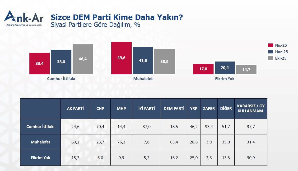 "Sizce DEM Parti kime yakın?" sorusuna hangi partinin ne yanıt verdiği ortaya çıktı. Nisan-Haziran ve Ekim aylarında yapılan ölçümlerde DEM Partinin Cumhur İttifakına daha yakın olduğunu düşünenlerin oranı düzenli bir şekilde artış gösterdi. Bu durum muhalefete yakındır diyenlerin oranında paralel bir şekilde düşüş olarak yansıdı.