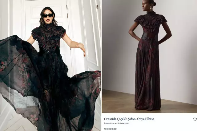 Ralph Lauren imzası taşıyan ve 6.600 euro (yaklaşık 319 bin 374 TL) değerindeki "Cressida Çiçekli Şifon Abiye Elbise", tam anlamıyla gotik romantizmin modern bir yorumu olarak değerlendiriliyor. Amerika merkezli ünlü moda markasının bu özel tasarımı, ipek şifon kumaşı, fırfır yakası ve bel kısmını vurgulayan özel deri kemeriyle (785 euro — yaklaşık 37 bin 988 TL) hem güçlü hem de zarif bir görünüm sunuyor.