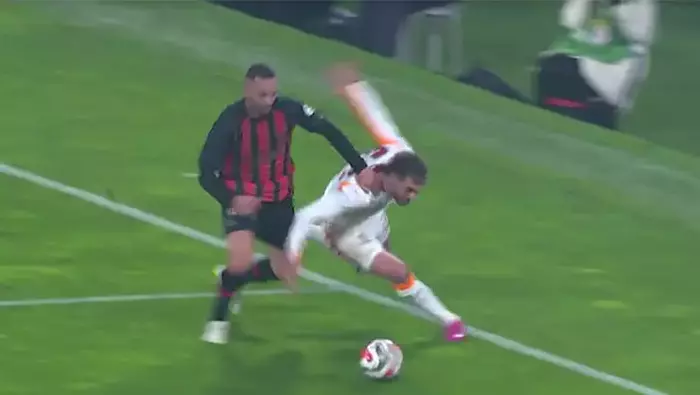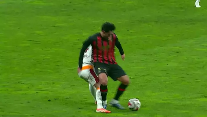 BARIŞ ALPER'İN YERDE KALDIĞI POZİSYONDeniz Çoban: Güzel çalım atmış oyuncu. Futbolun içinde olan bir mücadele var. Eliyle basıp yüklenmiyor. Oyuncu çalımdan sonra dengesini kaybedip küçülüyor. Devam kararı doğru.Bahattin Duran: Ben de kesinlikle bir ihlal olduğunu düşünmüyorum. Karagümrüklü oyuncunun eli Barış Alper'in omuzunda ama kesinlikle omuzundan bir basma yok. Faulü gerektirecek hiçbir müdahale yok. Dolayısıyla oyunun devam etme kararını doğru buluyorum.Bülent Yıldırım: Tek istisna ne olurdu; sırtından çeker ya da eliyle kuvvetli şekilde bastırırdı o zaman penaltı düşünürdüm ben de. Burada ikili mücadelede yan yana gelmeye çalışırken kaymanın da etkisiyle öne doğru bükülmüş o esnada rakibinin faul niteliğinde bir hamlesi olmamış.