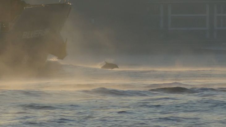 İstanbul Boğazı'nda sabahın erken saatlerinde deniz yüzeyinden buhar yükseldi. Gemilerin önünde de yunuslar da kameraya yansıdı.