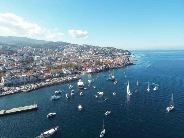 Bayraklarla süslenen teknelerin korteji, Mudanya sahilinde görsel bir şölen oluşturdu. O anlar dron kamerasıyla havadan görüntülendi.