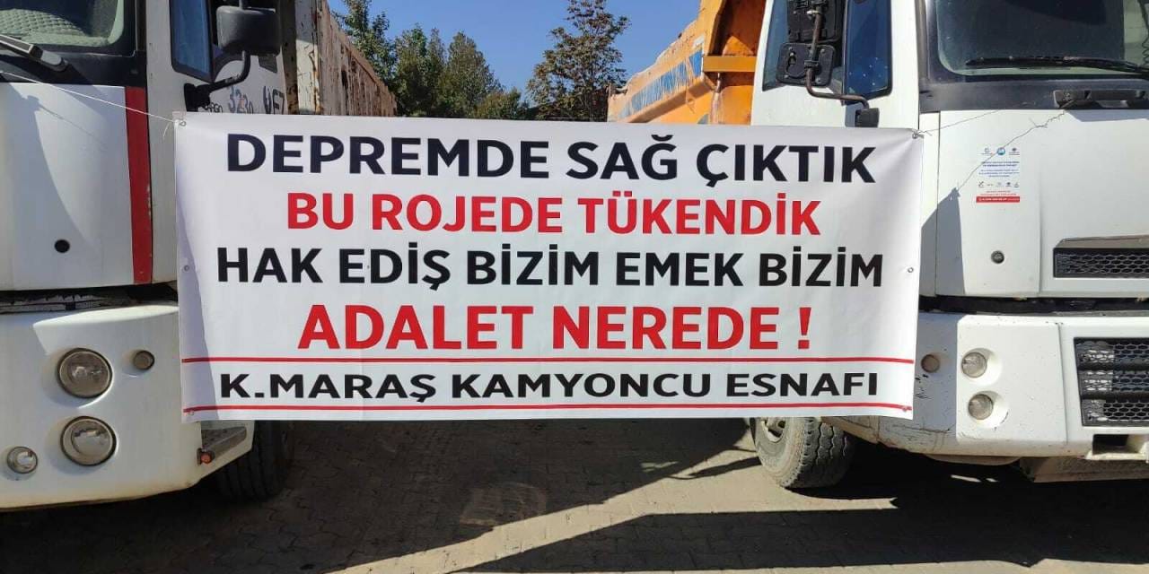 DEPREM BÖLGESİNDE TAŞERONLARIN SAADET ZİNCİRİ ORTAYA ÇIKTITaşeron firmadan alacaklarını tahsil edemeyen kamyoncu esnafı, "Bugün susarsak yarın aç kalırız", "Garibanın yüzü gülmez mi", "Esnaf ölüyor", “Kahramanmaraş esnafına sahip çık”, “Depremde ölmedik altyapı projesinde öleceğiz”, “Depremde sağ çıktık bu projede tükendik hak ediş bizim emek bizim adalet nerede” döviz ve afişleriyle yaşadıkları sıkıntıları protesto etti.