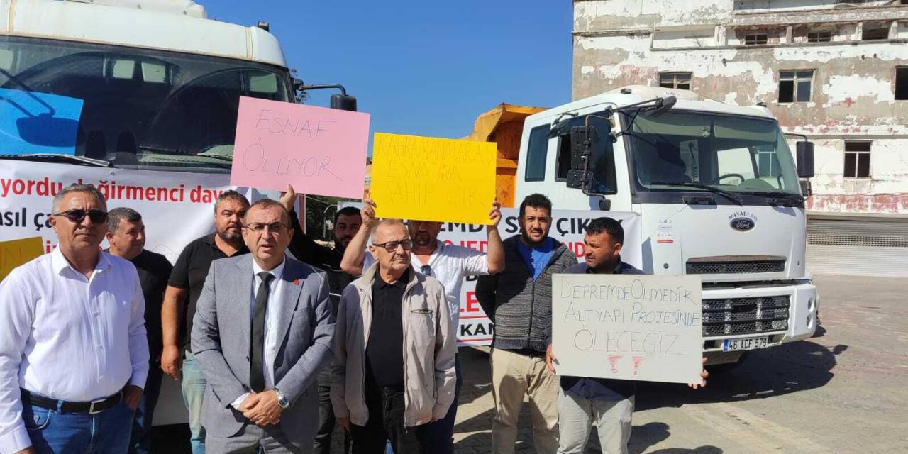 6 Şubat depremlerinin merkez üssü Kahramanmaraş’ta, altyapı yenileme çalışmalarını üstlenen taşeron firmaların kamyoncu ve iş makinesi operatörlerine ödeme yapmaması üzerine esnaf eylem yaptı.
