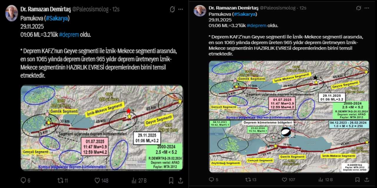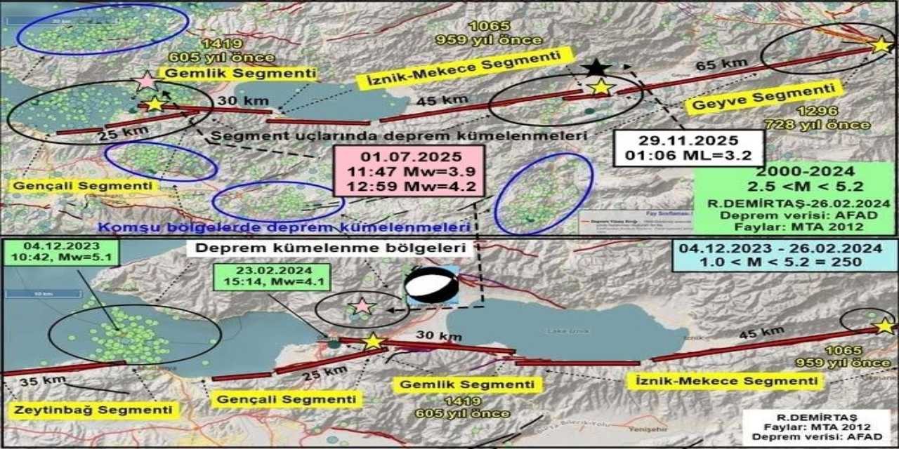 "Deprem KAFZ'nun Geyve segmenti ile İznik-Mekece segmenti arasında, en son 1065 yılında deprem üreten 965 yıldır deprem üretmeyen İznik-Mekece segmentinin HAZIRLIK EVRESİ depremlerinden birini temsil etmektedir."