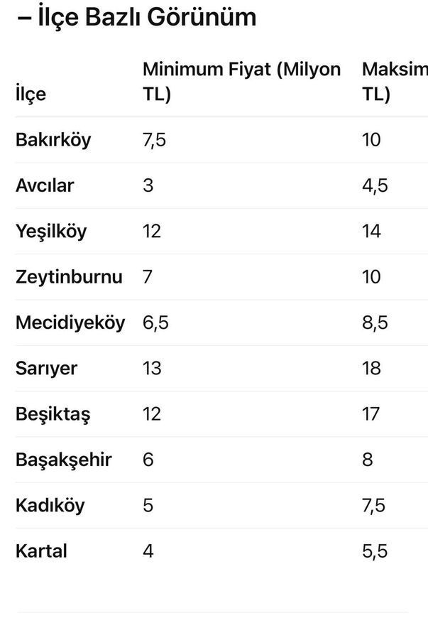 * Sahil kesimlerinde (Bakırköy, Yeşilköy, Zeytinburnu) fiyatlar yüksekliğini korusa da, yeni talepler iç bölgelere kayıyor.