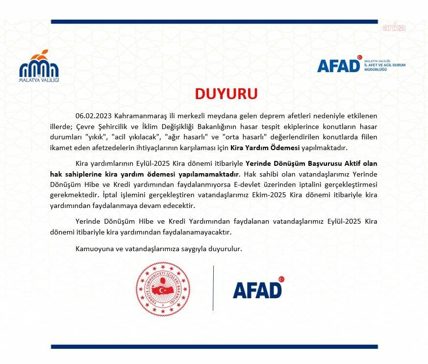 Malatya Valiliği İl Afet ve Acil Durum Müdürlüğü (AFAD), 6 Şubat depremlerinden etkilenen illerde kira yardımı uygulamasında yeni döneme geçildiğini duyurdu. Buna göre, Eylül 2025 kira döneminden itibaren “Yerinde Dönüşüm Başvurusu Aktif” olan hak sahiplerine artık kira yardımı ödemesi yapılmayacak.
