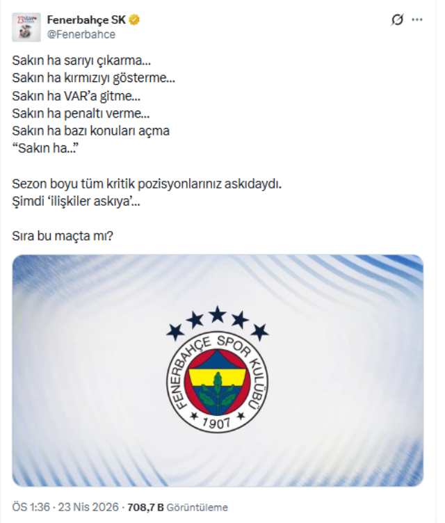 FENERBAHÇE'DEN JET YANIT GELDİGalatasaray'ın bu kararına Fenerbahçe'den jet tepki geldi. Fenerbahçe'den yapılan açıklamada, "Sakın ha sarıyı çıkarma… Sakın ha kırmızıyı gösterme… Sakın ha VAR’a gitme… Sakın ha penaltı verme… Sakın ha bazı konuları açma “Sakın ha…” Sezon boyu tüm kritik pozisyonlarınız askıdaydı. Şimdi ‘ilişkiler askıya’… Sıra bu maçta mı?" ifadeleri kullandı.