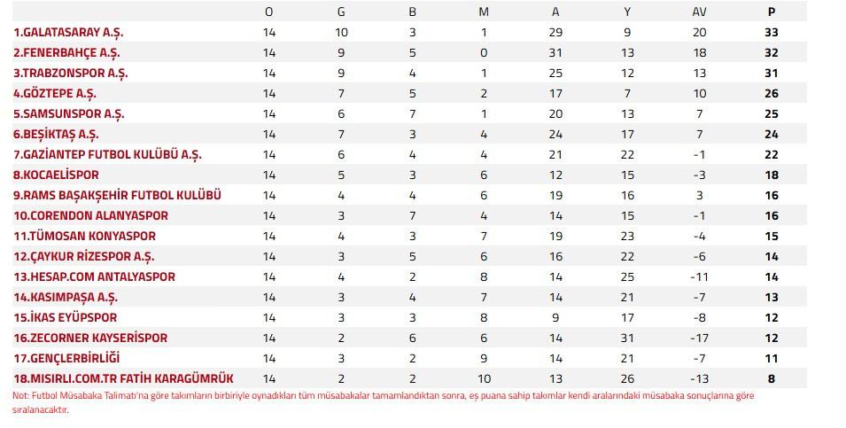 TAKIM O G B M A Y AV P 1.GALATASARAY 14 10 3 1 29 9 20 33 2.FENERBAHÇE 14 9 5 0 31 13 18 32 3.TRABZONSPOR 14 9 4 1 25 12 13 31 4.GÖZTEPE 14 7 5 2 17 7 10 26 5.SAMSUNSPOR 14 6 7 1 20 13 7 25 6.BEŞİKTAŞ 14 7 3 4 24 17 7 24 7.GAZİANTEP FK 14 6 4 4 21 22 -1 22 8.KOCAELİSPOR 14 5 3 6 12 15 -3 18 9.RAMS BAŞAKŞEHİR 14 4 4 6 19 16 3 16 10.CORENDON ALANYASPOR 14 3 7 4 14 15 -1 16 11.TÜMOSAN KONYASPOR 14 4 3 7 19 23 -4 15 12.ÇAYKUR RİZESPOR 14 3 5 6 16 22 -6 14 13.HESAP.COM ANTALYASPOR 14 4 2 8 14 25 -11 14 14.KASIMPAŞA 14 3 4 7 14 21 -7 13 15.İKAS EYÜPSPOR 14 3 3 8 9 17 -8 12 16.ZECORNER KAYSERİSPOR 14 2 6 6 14 31 -17 12 17.GENÇLERBİRLİĞİ 14 3 2 9 14 21 -7 11 18.FATİH KARAGÜMRÜK 14 2 2 10 13 26 -13 8