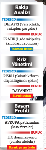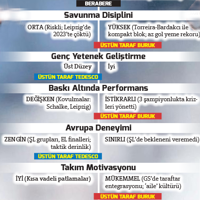 Buruk şampiyonlukları ve kriz yönetimiyle adından söz ettirdi; Tedesco ise Avrupa’da elit potansiyelli ancak istikrarsızlığı handikap. Tedesco’nun taktik zekâsı Buruk’un takımının fiziksel üstünlüğünü zorlayabilir. Ama Buruk’un derbi deneyimi hissediliyor. Buruk, Türkiye’nin Klopp’u bir maestro; Tedesco ise yıldız avcısı ama uzun soluklu değil.