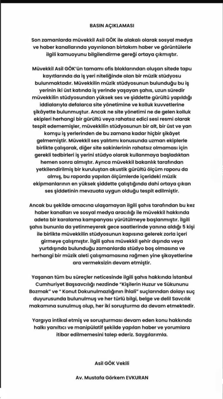 Asil Gök'ün avukatı aracılığıyla yapılan resmi açıklamada, stüdyoya dair gürültü şikâyetlerinin site yönetimi, polis ekipleri ve hatta bakanlık tarafından yetkilendirilmiş bir kuruluşun yaptığı akustik ölçümlerle de doğrulanamadığı belirtildi.