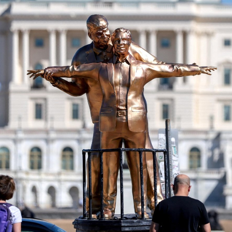 ABD’nin başkenti Washington, D.C.’de anonim bir sanat kolektifi tarafından yapılan ve “Best Friends Forever” (En İyi Dostlar) olarak da anılan heykel, ABD Başkanı Donald Trump ile reşit olmayan bireylere cinsel istismarda bulunma suçundan yargılanan Jeffrey Epstein’i el ele tutuşmuş ve dans eder gibi tasvir ediyor. Yaklaşık 12 metre yüksekliğindeki heykel, kolektifin kendisini “The Secret Handshake” olarak tanıtan üyeleri tarafından politik bir sanat protestosu olarak hazırlandı. Heykelin kaidesinde, Trump’ın Epstein’a yazdığı iddia edilen bir doğum günü mesajından alıntılar bulunduğu ifade edildi.