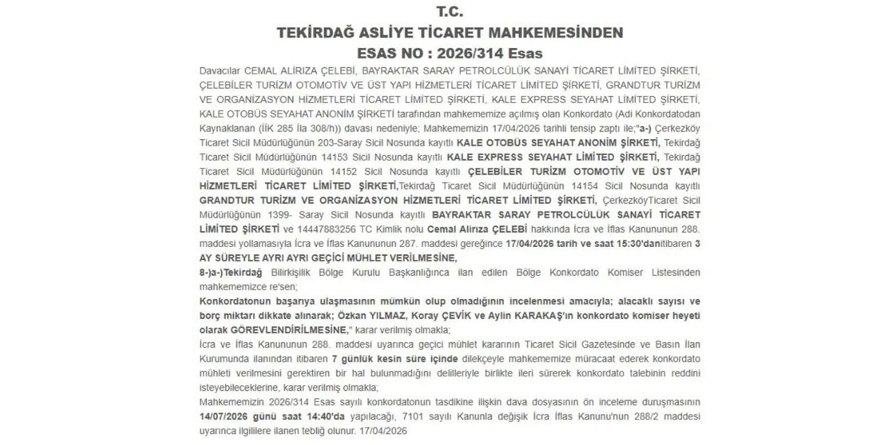 Tekirdağ Asliye Ticaret Mahkemesi, Kale Otobüs Seyahat ve bünyesindeki bağlantılı şirketlerin mali yapısını inceleyerek "geçici mühlet" kararı verdi. Mahkeme kararı uyarınca, grup bünyesindeki şirketler 3 ay boyunca icra takiplerine karşı koruma kalkanına alınmış oldu.
