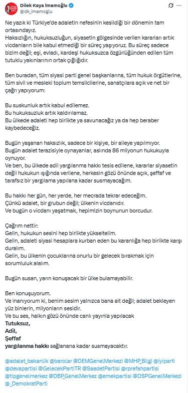 "Ne yazık ki Türkiye’de adaletin nefesinin kesildiği bir dönemin tam ortasındayız. Haksızlığın, hukuksuzluğun, siyasetin gölgesinde verilen kararları artık vicdanların bile kabul etmediği bir süreç yaşıyoruz" diyen Dilek İmamoğlu sosyal medya hesabından yaptığı paylaşımda şunlara yer verdi:
