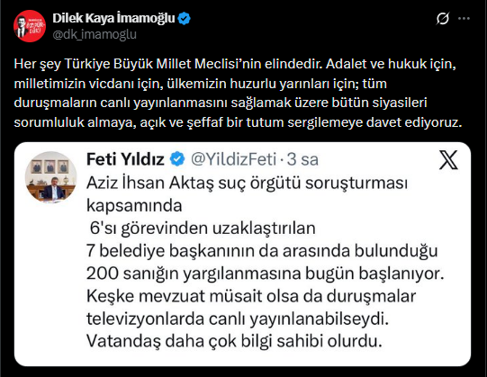 Yıldız’ın bu çıkışına sosyal medya hesabından yanıt veren Dilek Kaya İmamoğlu, adaletin tesisi için tüm siyasi partileri sorumluluk almaya davet etti. İmamoğlu paylaşımında, "Her şey Türkiye Büyük Millet Meclisi’nin elindedir" ifadelerini kullandı.
