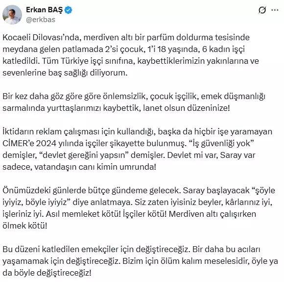 "İŞÇİLER CİMER'E ŞİKAYETTE BULUNDU" İDDİASIÖte yandan Türkiye İşçi Partisi Genel Başkanı Erkan Baş'tan da çarpıcı bir iddia geldi. Baş, işçilerin 2024 yılında "İş güvenliği yok" diyerek CİMER'e şikayette bulunduğunu söyledi.