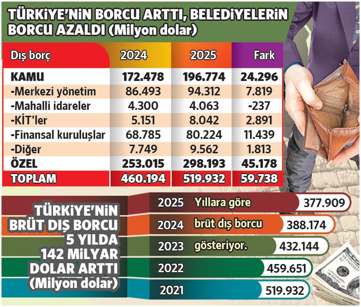 Kamuya ait 196.8 milyar dolarlık borcun 94.3 milyar dolarını merkezi yönetim, 80.2 milyar dolarını kamu banka ve finans kurumları, 8 milyar dolarını KİT’ler 9.6 milyar dolarını diğer kamu kurumları yaptı. Bu kurumlar son bir yılda yurt dışından 24.3 milyar dolar yeni kredi alıp kullandı. Buna karşılık 94.3 milyar dolarlık borcun 4 milyarını üstlenen belediyelerin brüt dış borcu 2025’te 237 milyon dolar birden azaldı. Bu veri, iktidarın muhalefet belediyelerinin dışarıdan kredi getirmelerini engelleyen düzenleme ve uygulamalarının sonucu olarak yorumlanıyor. Kısıtlamalar nedeniyle belediyeler 2025’te dışarıdan ilave kredi alamadığı gibi eski borçlarını da kendi kaynaklarından ödemek zorunda kaldı.