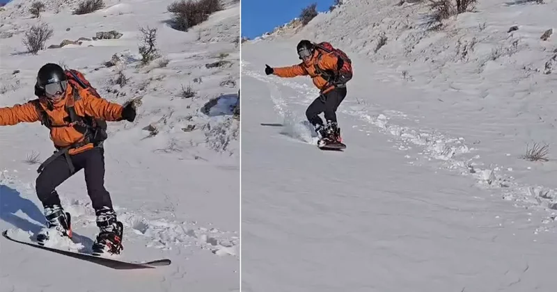 Diş hekimi tırmandığı dağdan snowboard yaparak indi