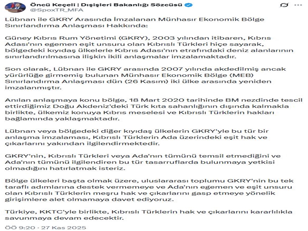 "GKRY, 2003 yılından itibaren Kıbrıs Adası'nın egemen eşit unsuru olan Kıbrıslı Türkleri hiçe sayarak, bölgedeki kıyıdaş ülkelerle Kıbrıs Adası'nın etrafındaki deniz alanlarının sınırlandırılmasına ilişkin ikili anlaşmalar imzalamaktadır. Son olarak, Lübnan ile GKRY arasında 2007 yılında akdedilmiş ancak yürürlüğe girmemiş bulunan Münhasır Ekonomik Bölge (MEB) Sınırlandırma Anlaşması dün (26 Kasım) iki ülke arasında yeniden imzalanmıştır. Anılan anlaşmaya konu bölge, 18 Mart 2020 tarihinde BM nezdinde tescil ettirdiğimiz Doğu Akdeniz'deki Türk kıta sahanlığının dışında kalmakla birlikte, ülkemiz konuya Kıbrıs meselesi ve Kıbrıslı Türklerin hakları bağlamında yaklaşmaktadır."