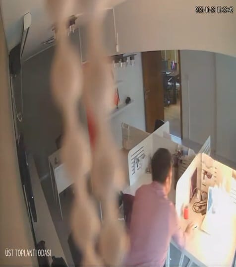 Patlamanın etkisiyle bilgisayar kullanılamaz hale gelirken, çalışma masasında da hasar oluştu. O anlar, iş yerinin güvenlik kamerası yansıdı.